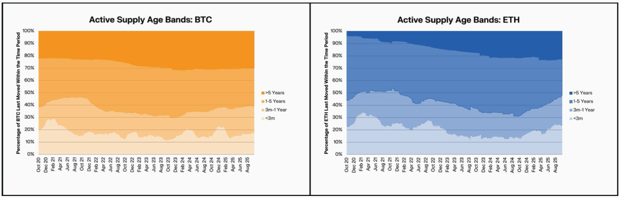 ETHâs 1+ year dormancy dropped to 51.7%, meaning old coins are moving more.