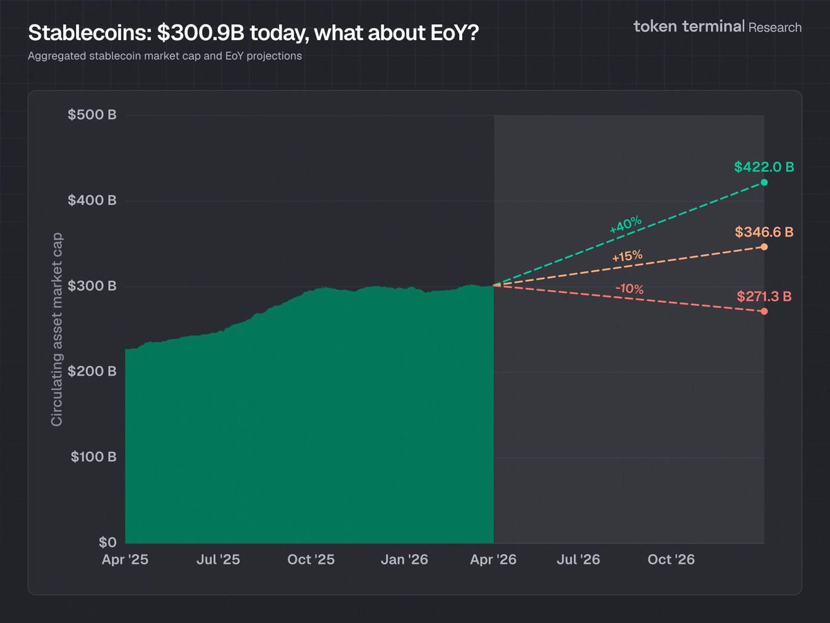 Stablecoins now sit at $300.9 billion in aggregate market cap, and Token Terminal outlined three possible paths for the end of 2026.