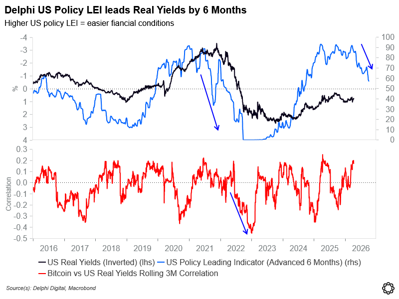 At the same time, Delphiâs US Policy LEI is rolling over, and Delphi says it has historically led real yields by about six months.