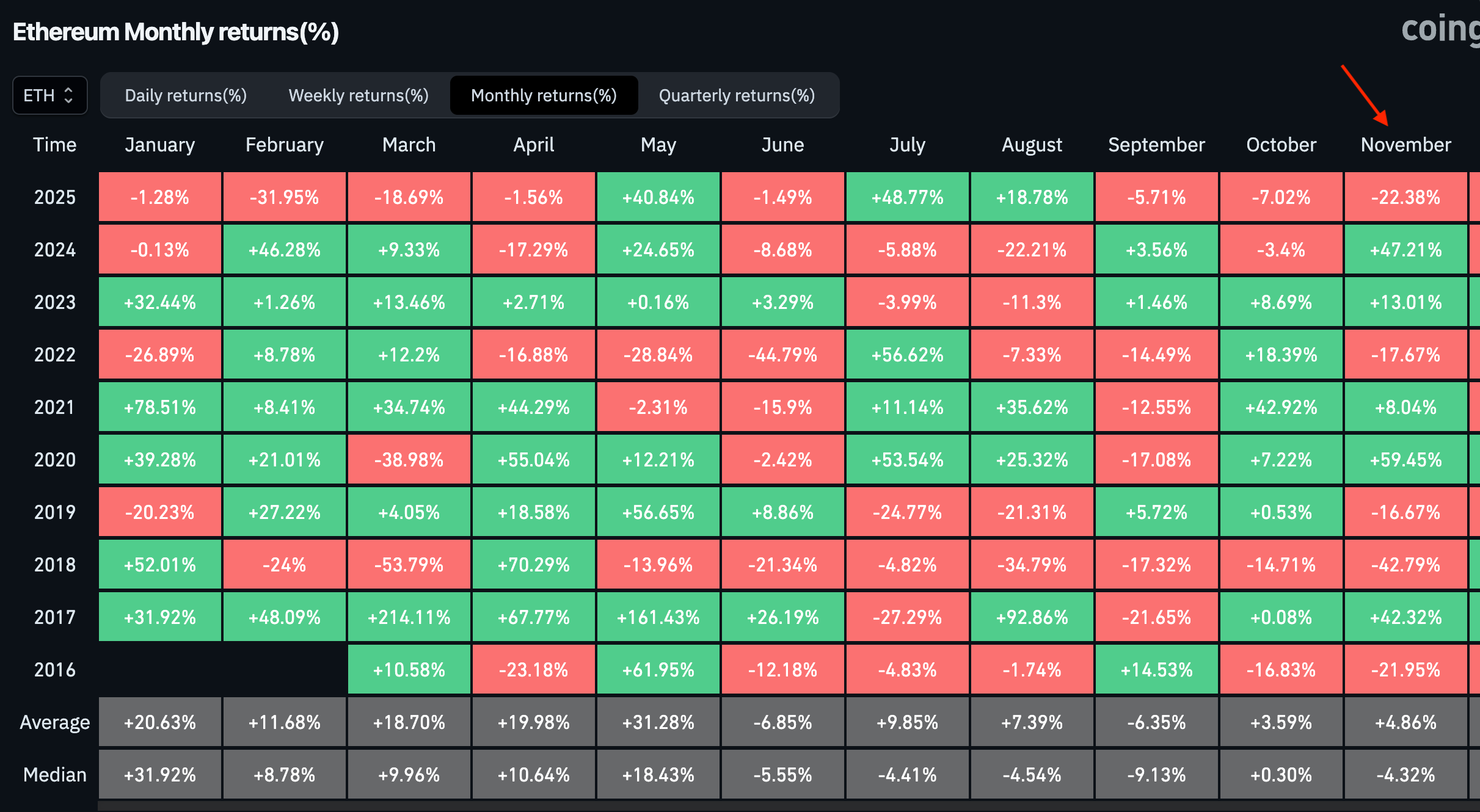 Ethereum just printed its second worst November return in history at -22.38% — only surpassed by the brutal -42.79% crash in 2018.