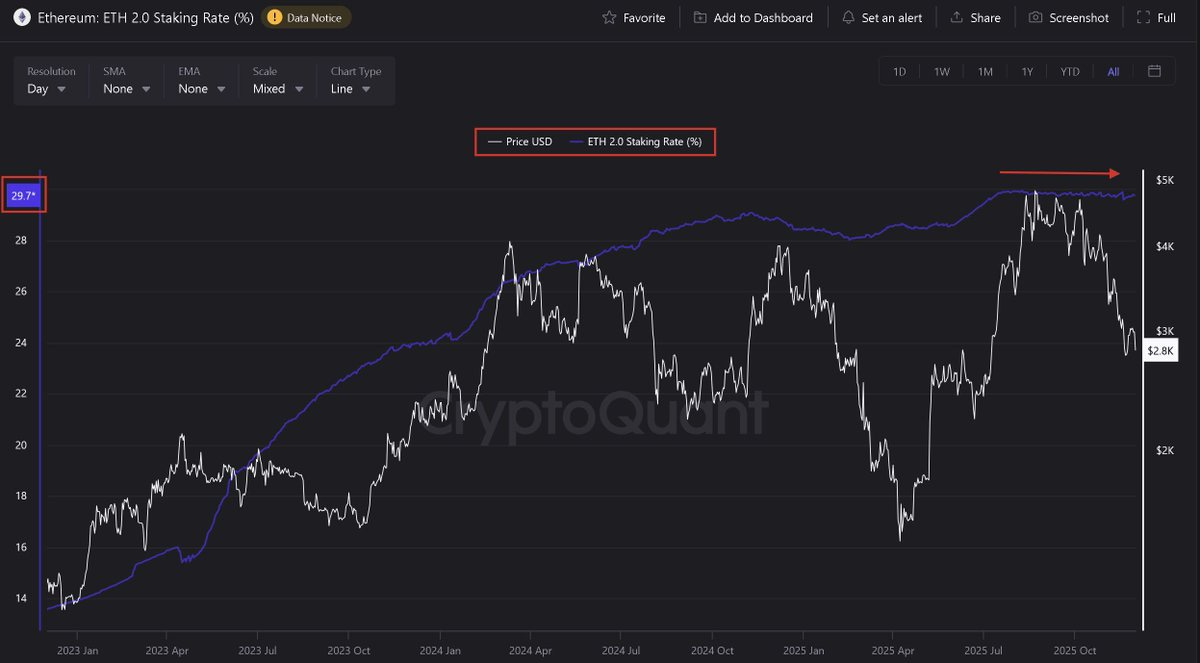 ETH 2.0 staking rate is holding steady at 29.7% — near all-time highs.