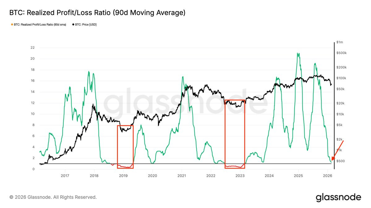 BTC’s Realized Profit/Loss Ratio is back near levels we usually see around bear-market bottoms.