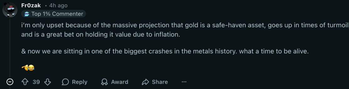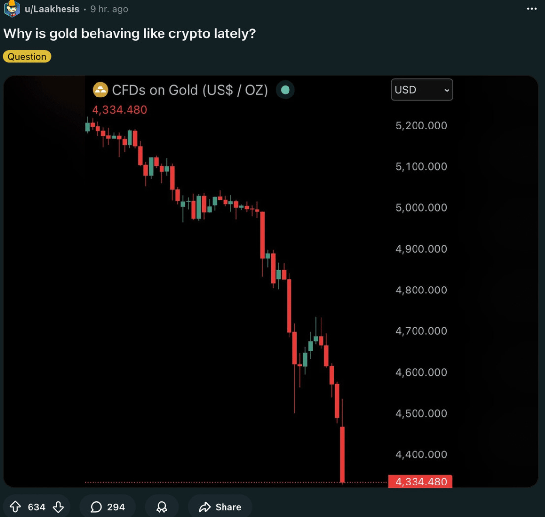 After falling roughly 22% from its all-time high, gold holders on Reddit are asking the same questions crypto traders ask after a major drawdown: Isn’t this supposed to be a safe haven? Why is it moving like a risk asset?