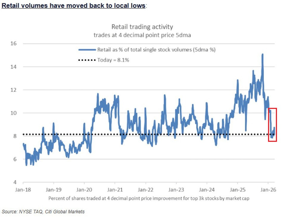 Retail trading activity has fallen to just 8.1% of total stock volume, its lowest level since Q3 2024. That is a major unwind from the 15.0% peak in November 2025, when retail participation was running at nearly double today’s level.
