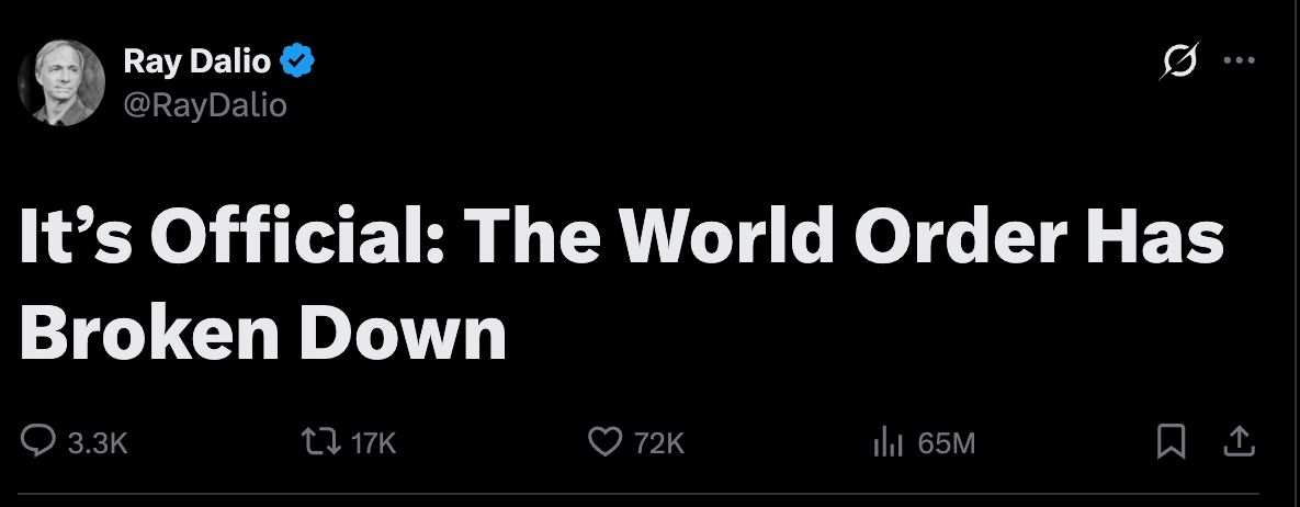 Ray Dalio just published a long post arguing that the post-1945 world order is “officially broken down”—and that we’re entering the ugly part of what he calls the “Big Cycle”.