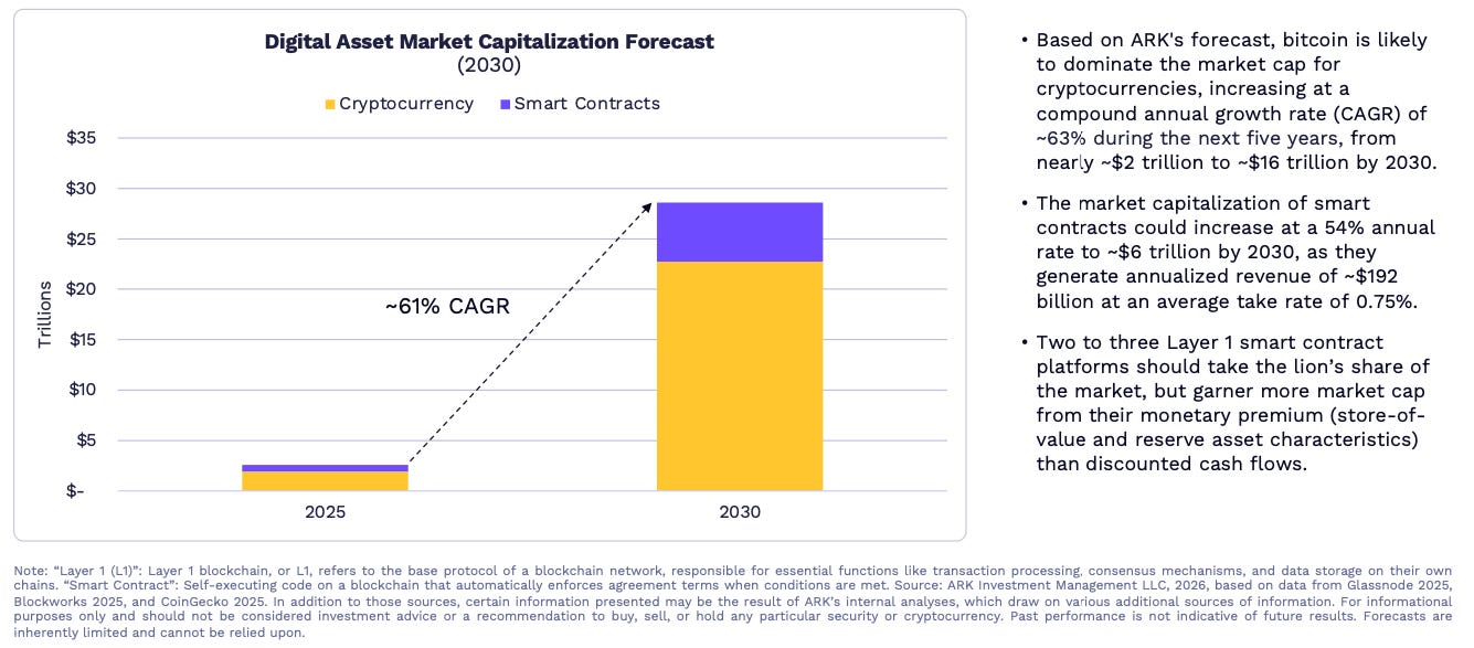 ARK’s updated forecast puts BTC’s 2030 market cap between $5T–$10T, factoring in: