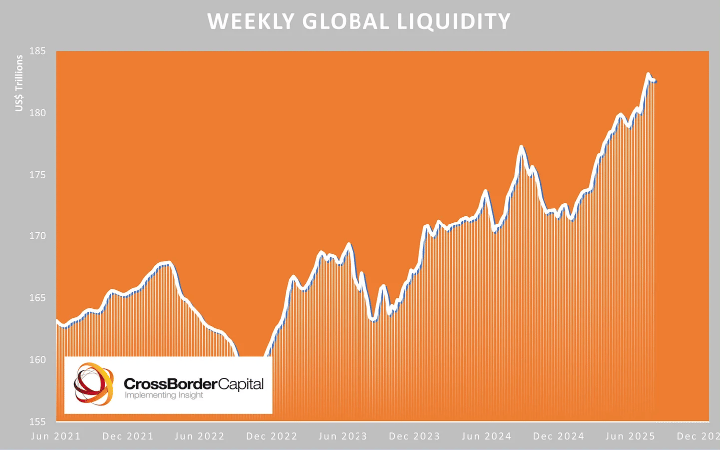 Liquidity growth is slowing, but the trend line is still up. The three-month annualized expansion rate slowed to 6.7% (down from 8.8% last mont).