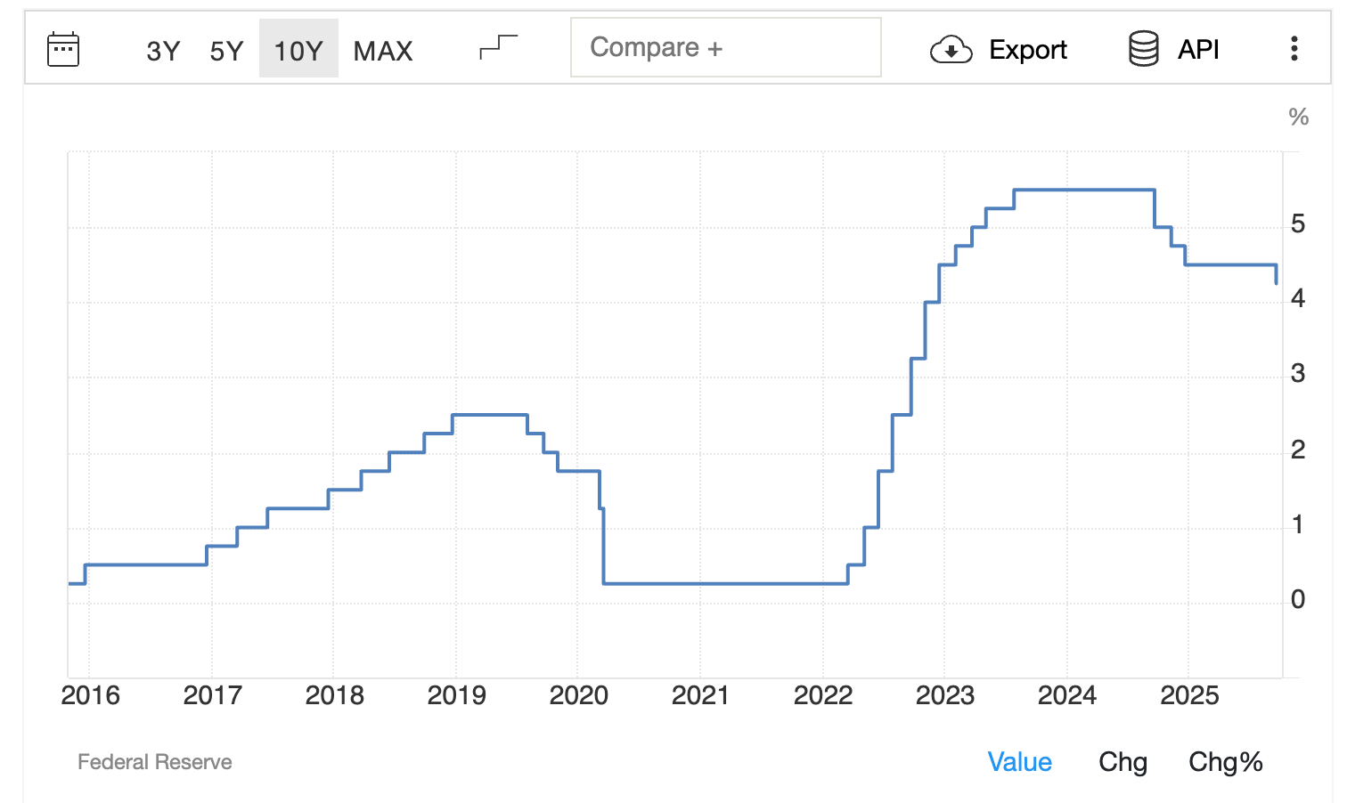 Fed Rate: 4.25% → Slight easing, no pivot yet