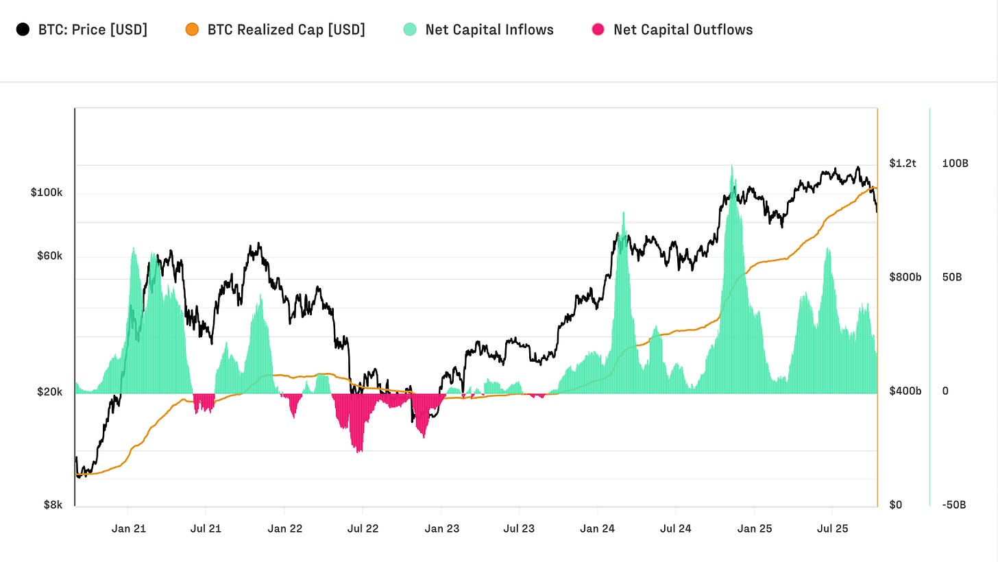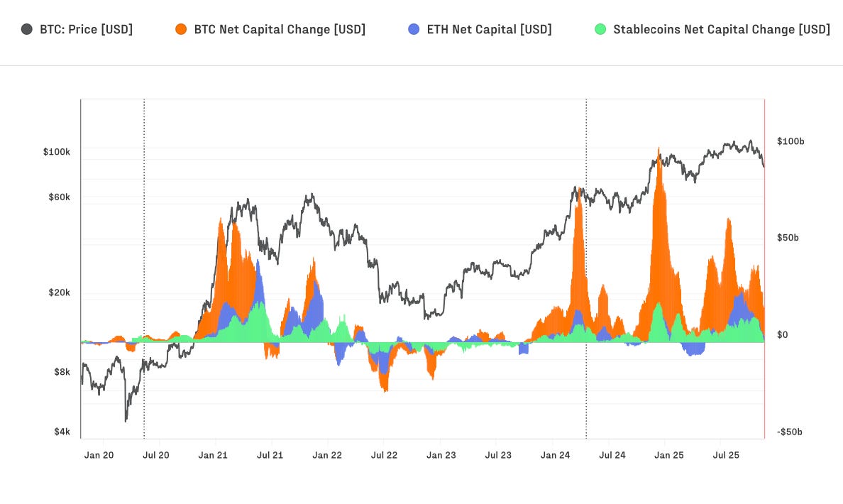 Glassnode shows that Bitcoin absorbed up to $190B/month in fresh capital, while Ethereum and altcoins saw minimal flows.
