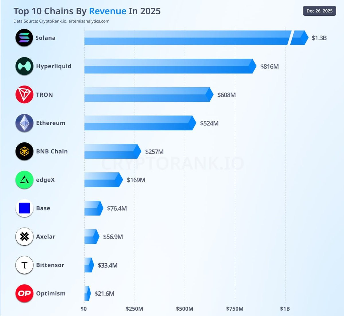 Solana just claimed the #1 spot in total on-chain revenue for 2025 — earning a massive $1.3 billion, according to CryptoRank data.